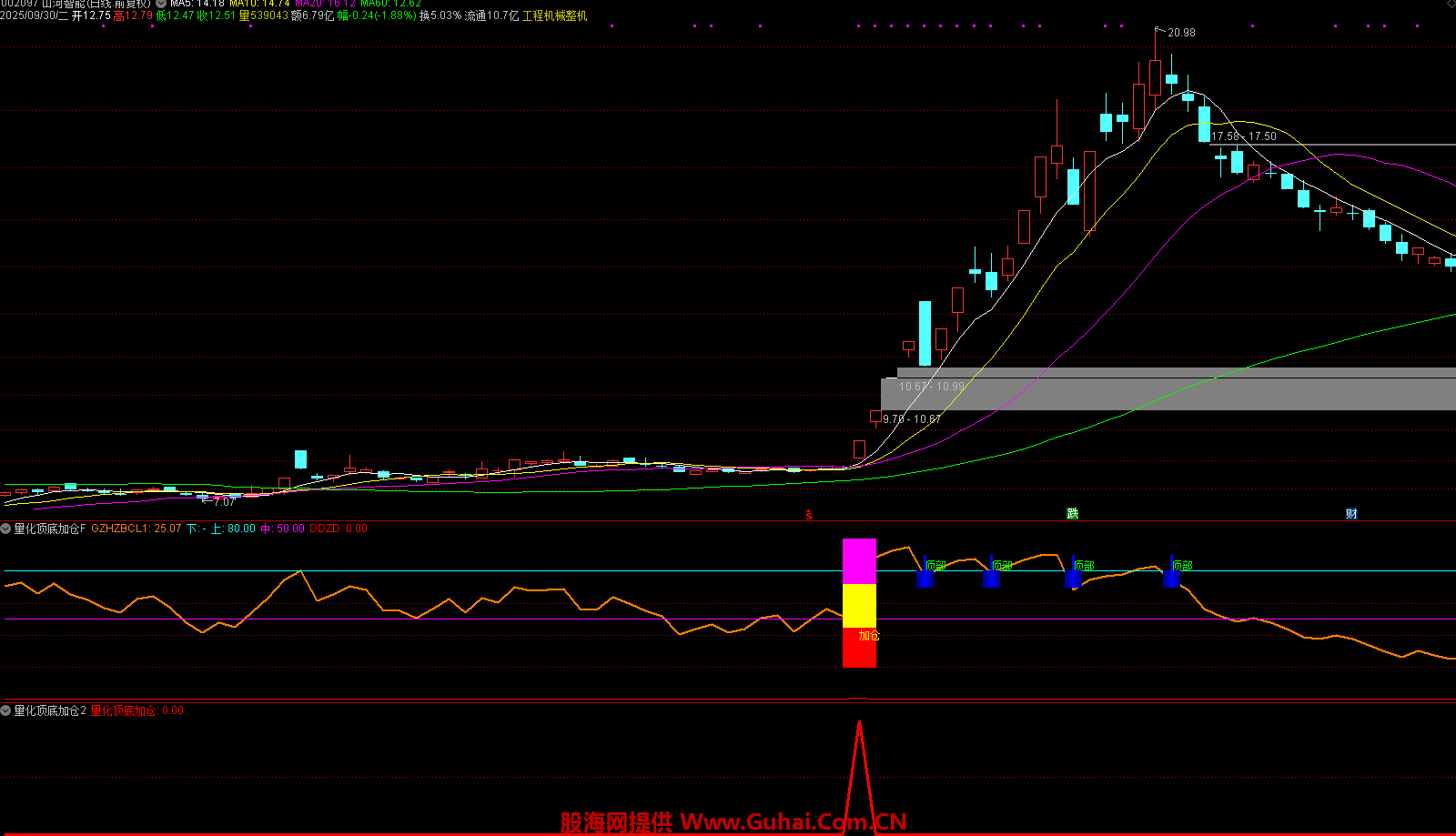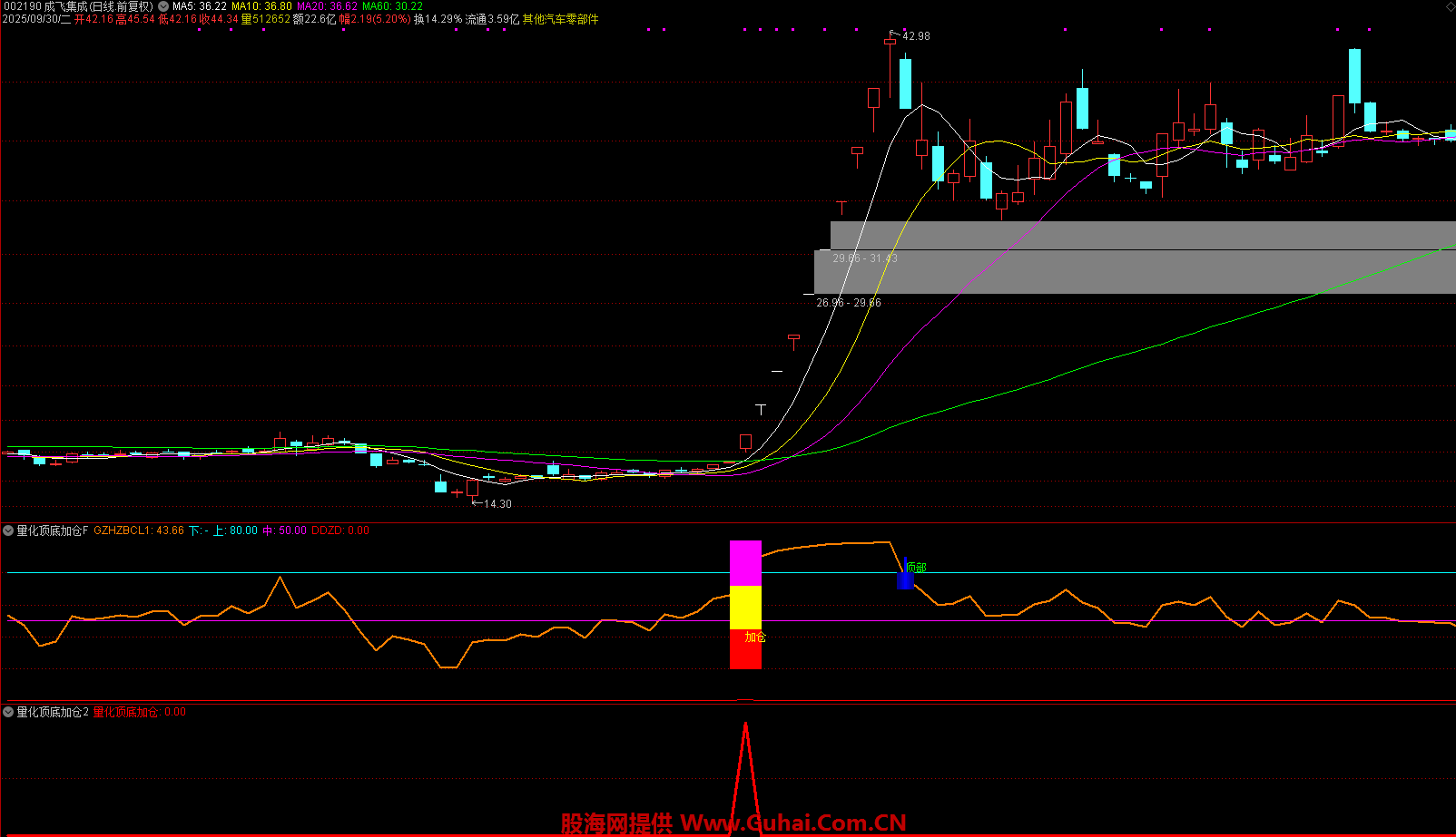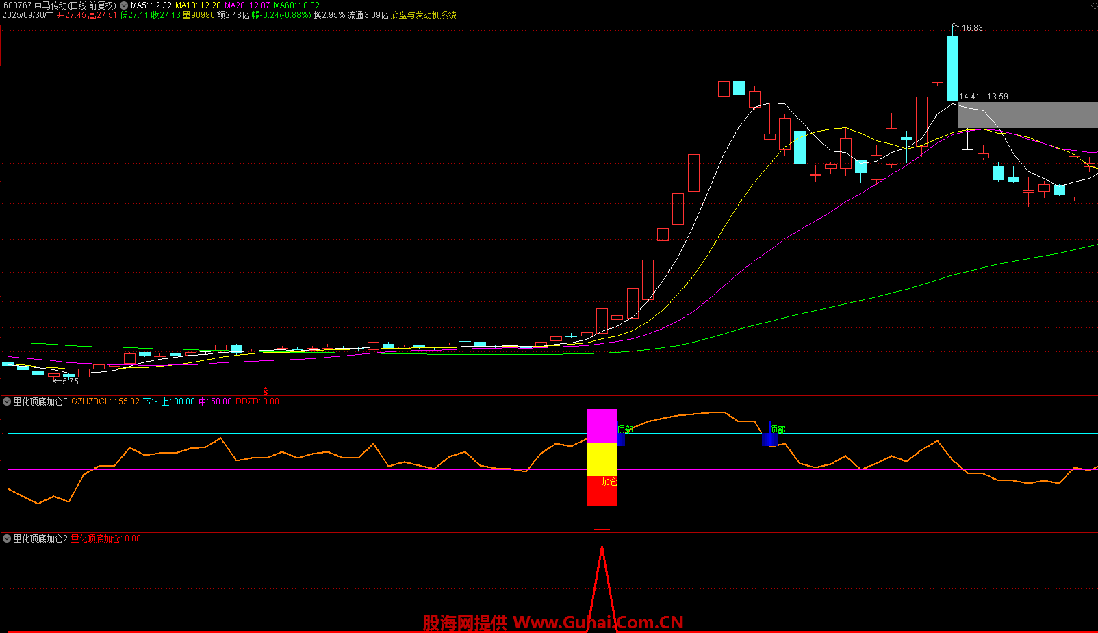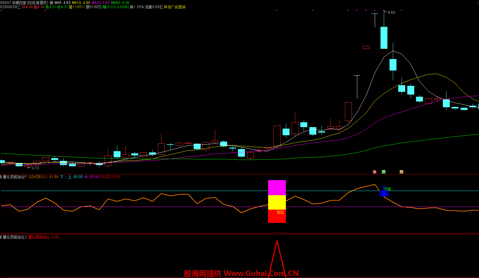 指标包括两附图,三选股指标,选股包括底部信号,黑马信号,以及加仓信号,至于顶点信号在附图上显示,信号仅供参考。