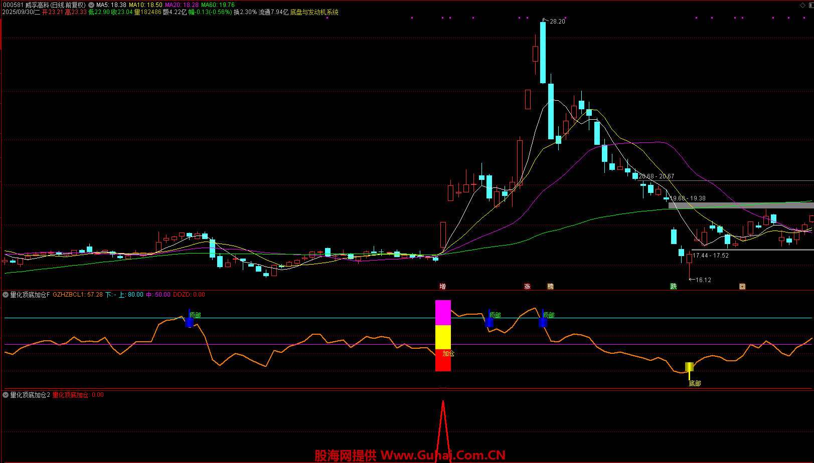 指标逻辑概述该指标是一个综合性的趋势判断与买卖点提示工具,通过多重条件过滤识别股票的顶底区域和加仓机会。