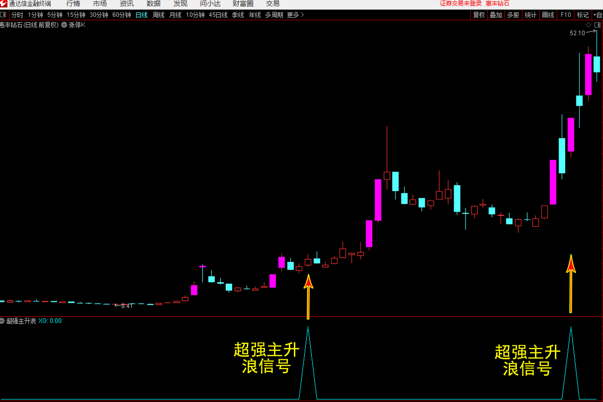 1.超强主升浪副图出现大箭头时为买入信号,跌破该K线最低点止损;