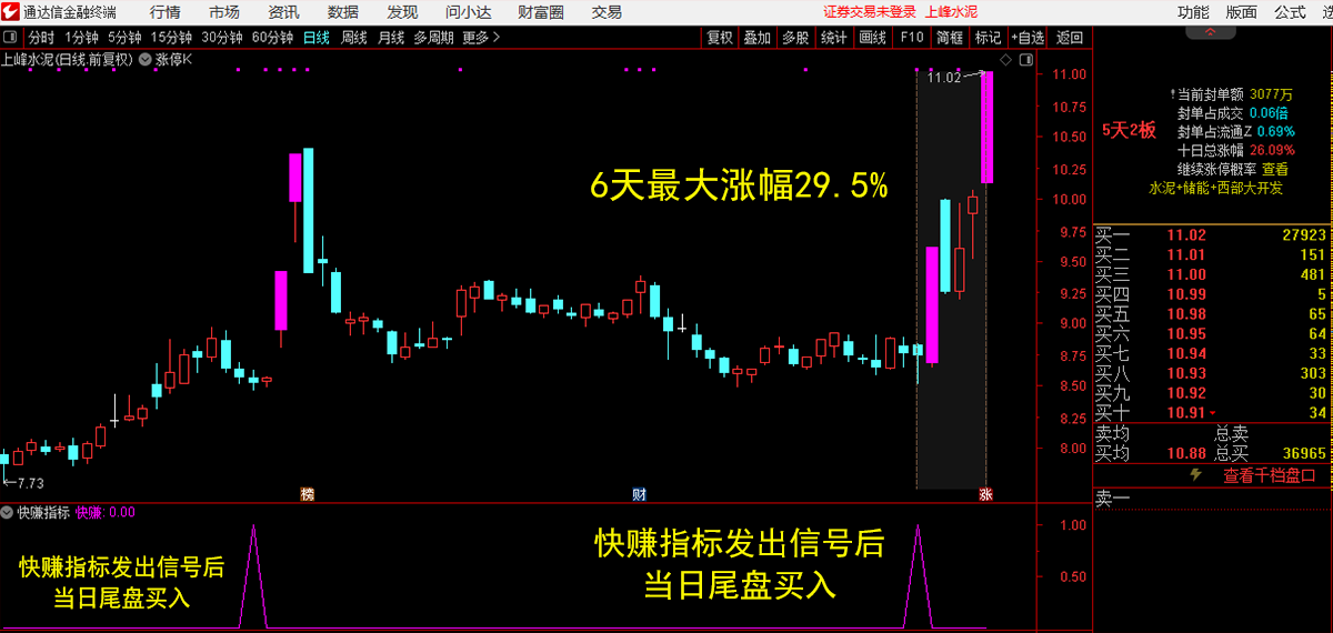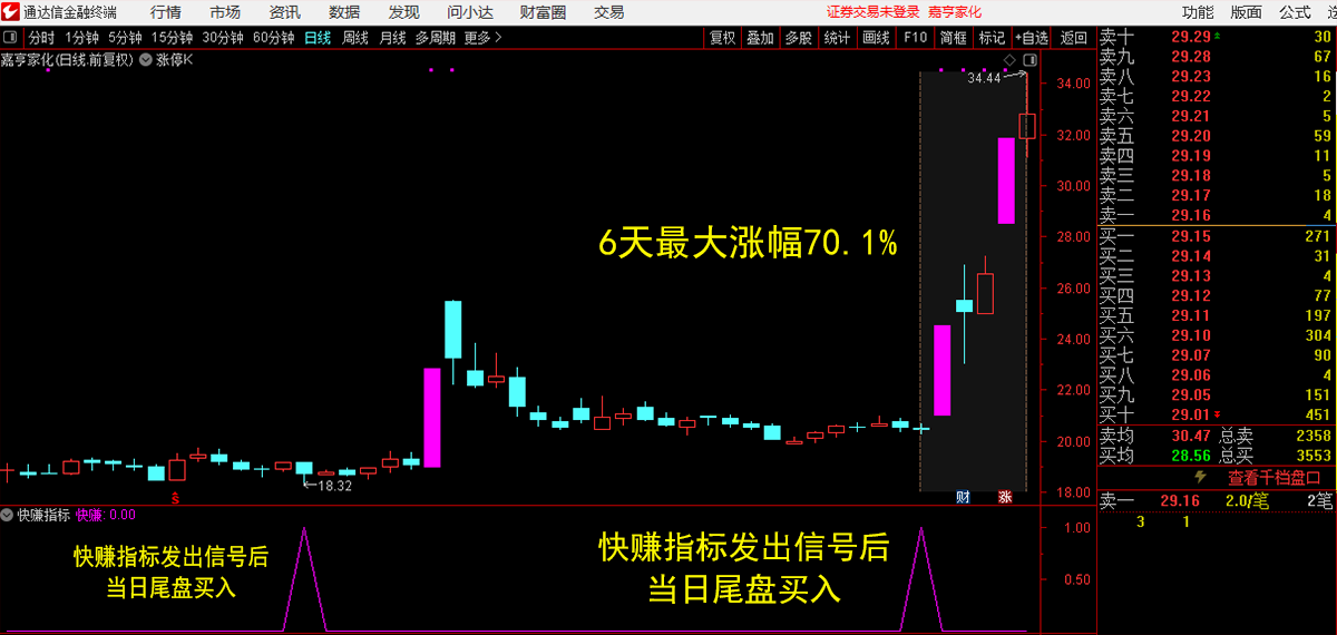 1.快赚指标出现大箭头时为买入信号,跌破该K线最低点止损;