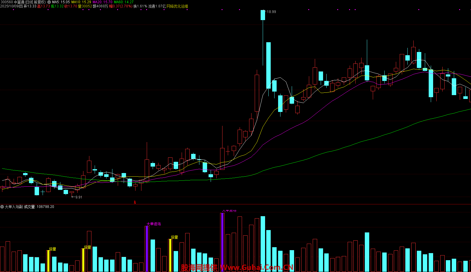 策略上,当出现彩色柱状标记(品红色)或显示大单进场文字时,可视为买入信号;