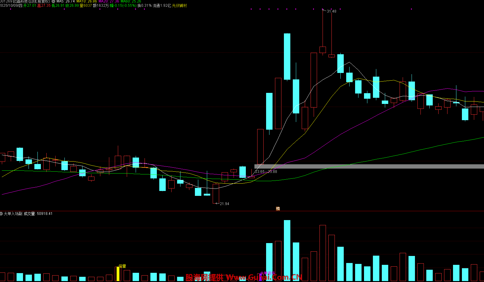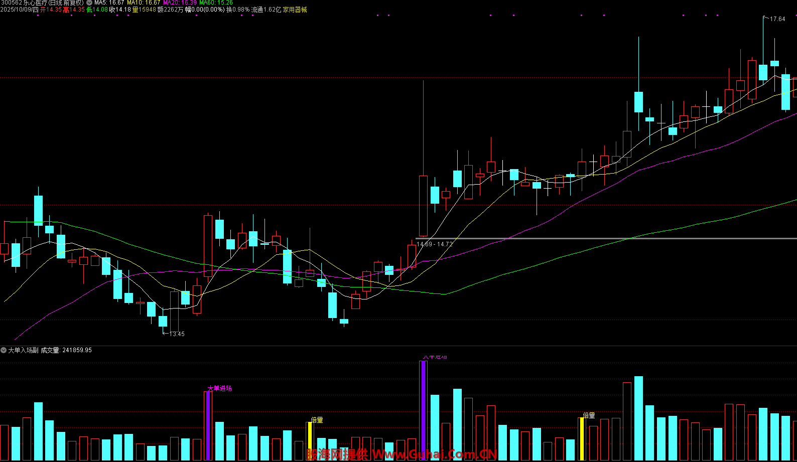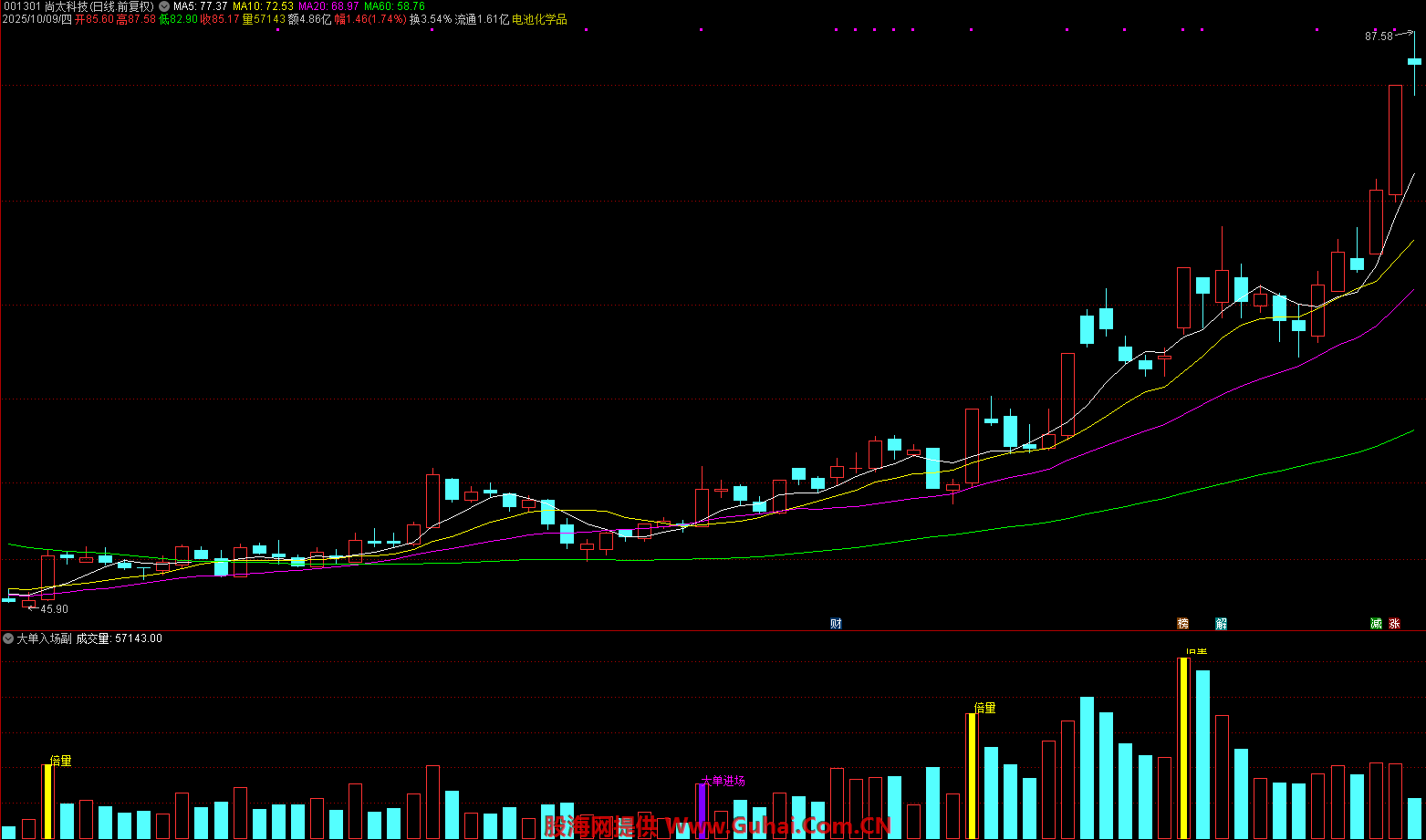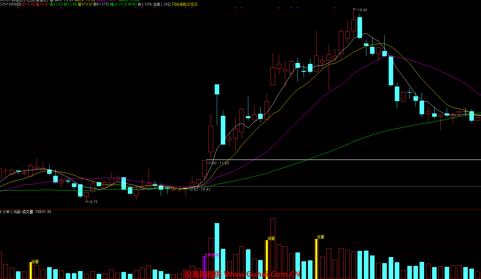 指标主要用于捕捉大资金入场信号。它通过计算短期与长期均线的差值,结合成交量放大和价格突破来识别大单进场。