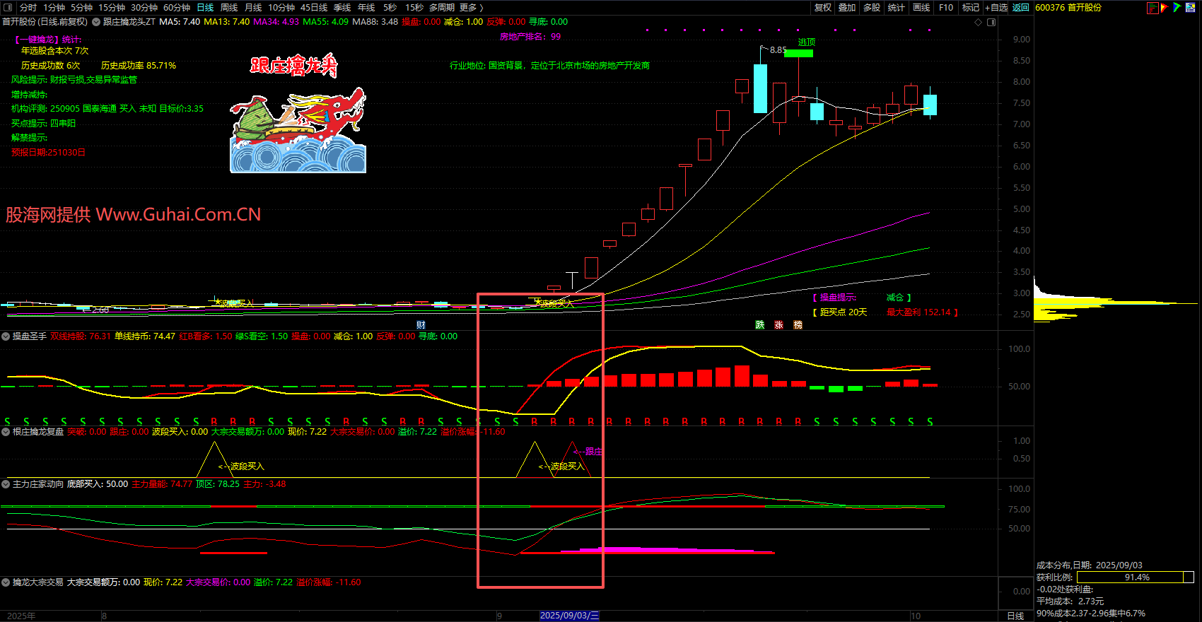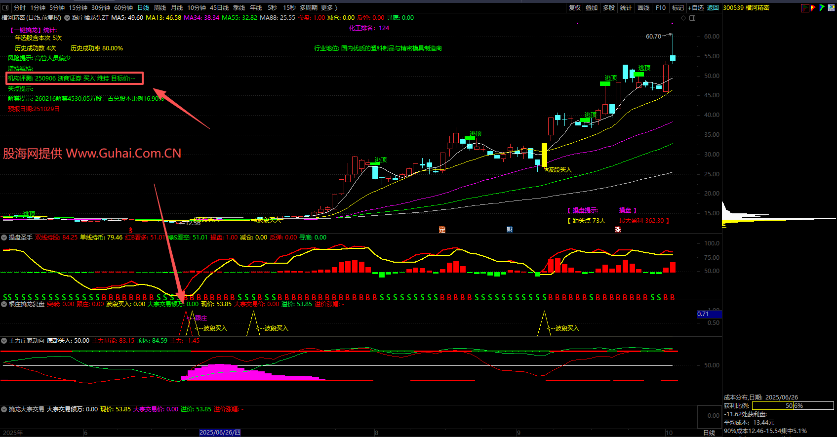 1、“主力庄家动向”指标显示主力买入、主力力量能、顶区主力等数据偏强,反映主力资金在关键节点(如底部、顶区)的参与度高,对股价形成支撑。