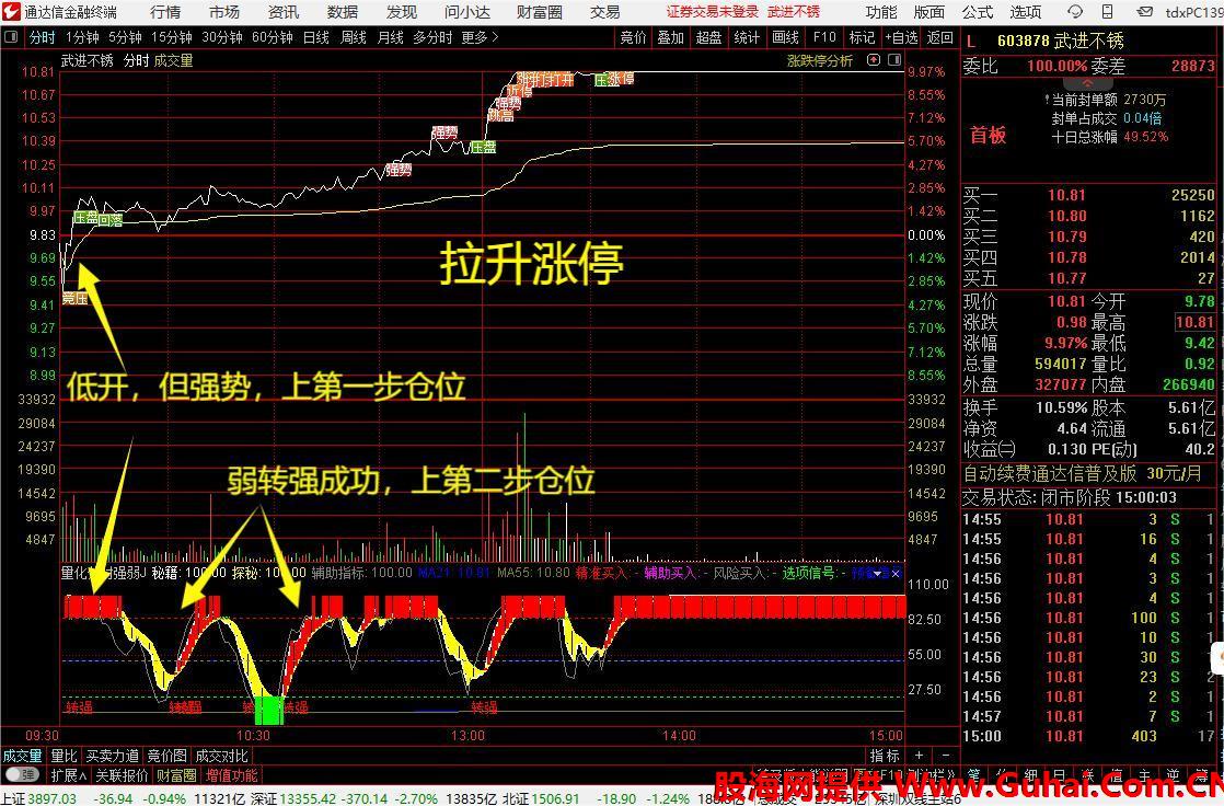 (2)案例2:开盘为红块远多余绿块,拉升涨停(分步上车)