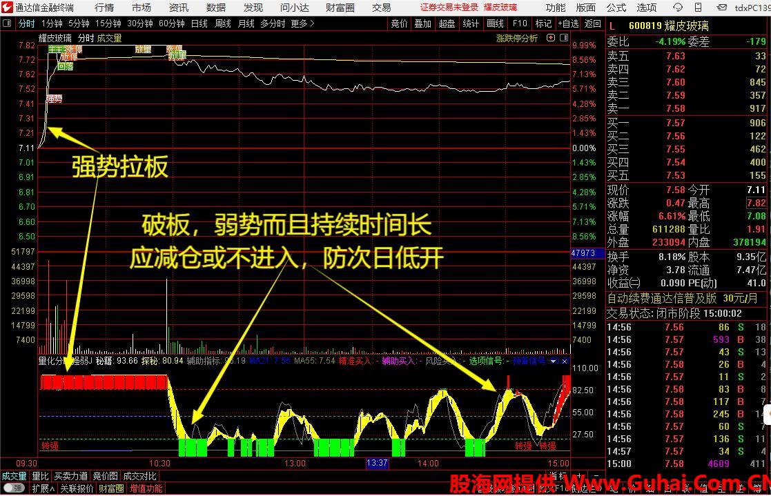 (5)案例5:涨停破板后长时间弱势,不能回封(减仓或不能进入,以防次日低开)