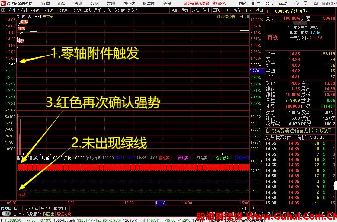 是整个套装指标的基石和理论基础,精准判断日内个股上涨与下跌,也就是说满足该要求的个股日内大涨概率90%以上,原理及识图如下: