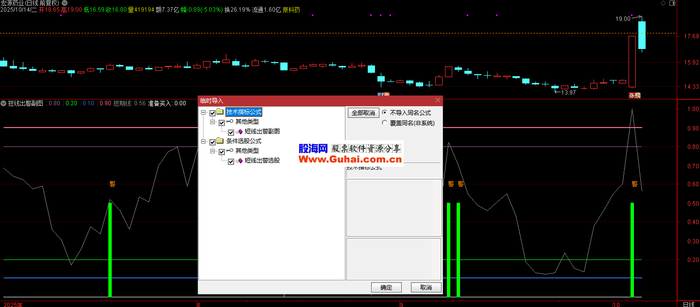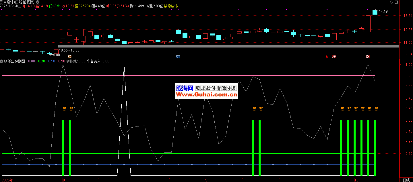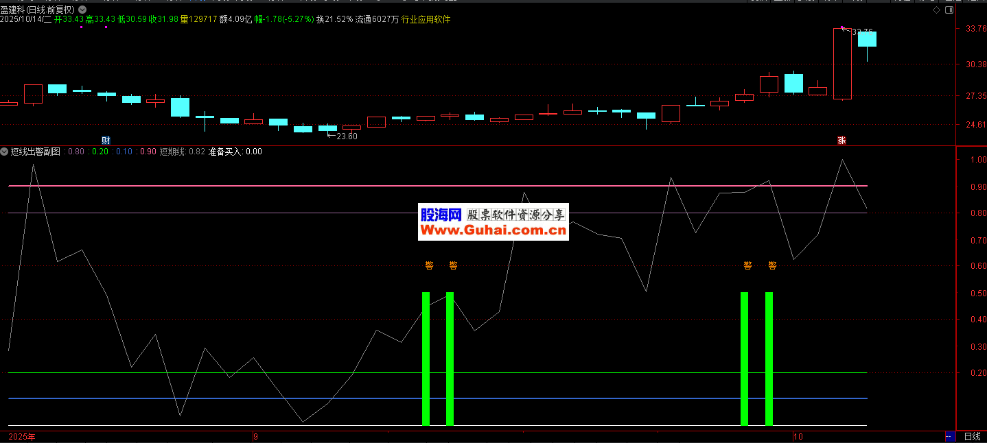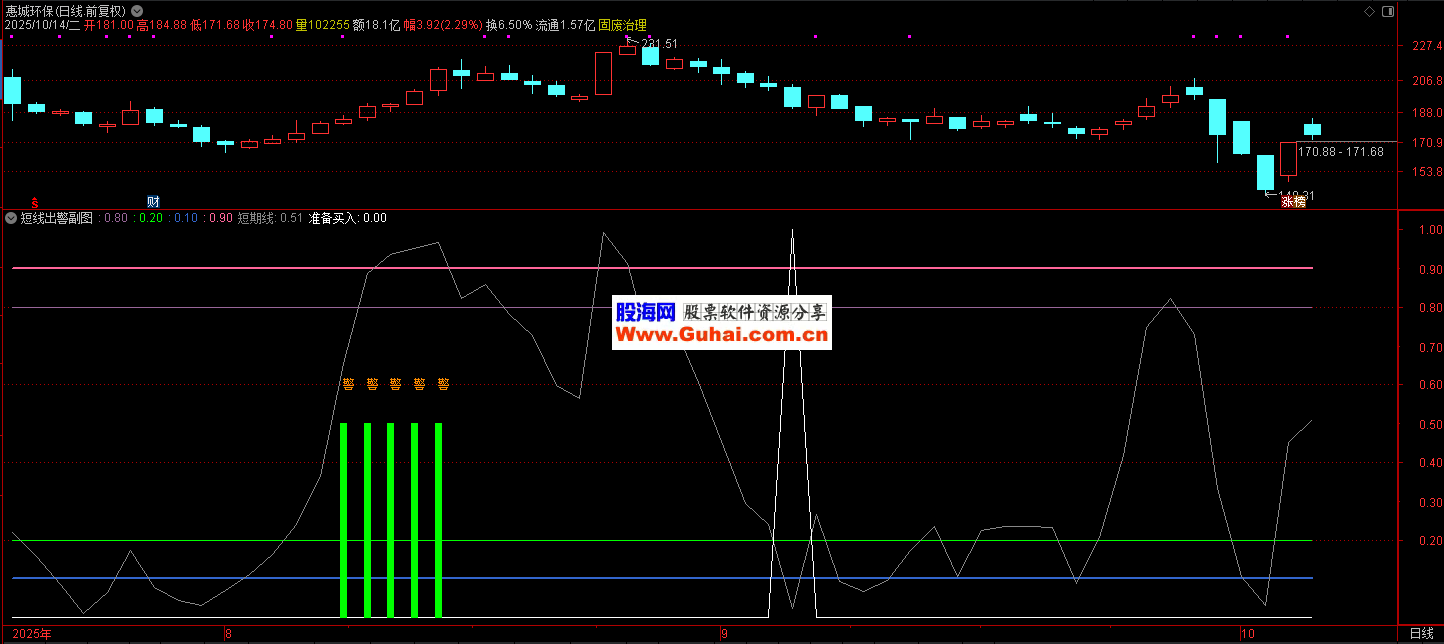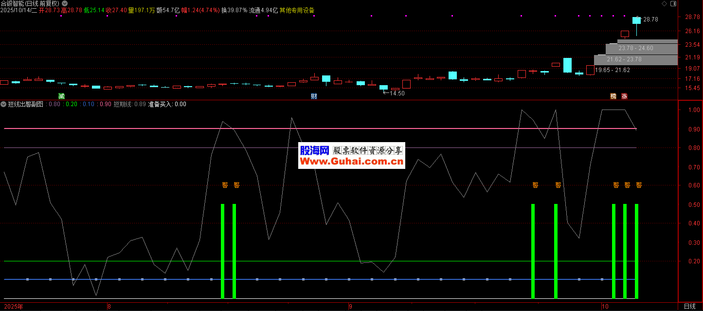 HG26指标低于4时显示准备买入提示,高于85时触发绿色警戒柱状图。