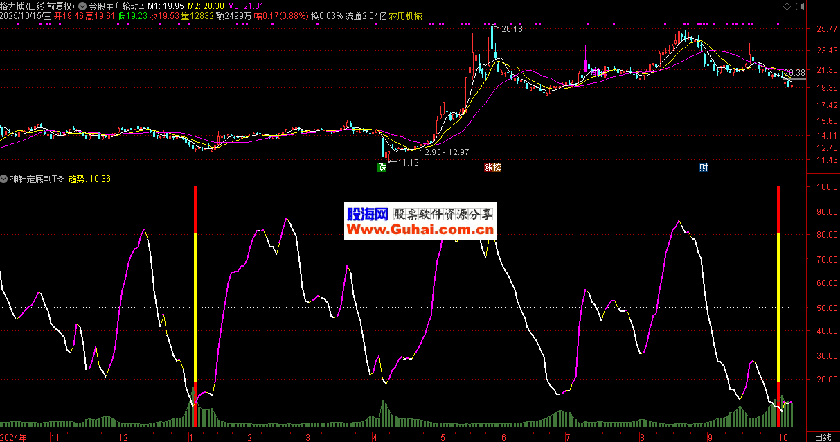 指标通过红黄相间的柱状图标记关键位置(90和10),结合25日高低价差计算趋势强度。当短期均线突破长期均线且满足特定条件时,会触发红黄分段柱状图信号。