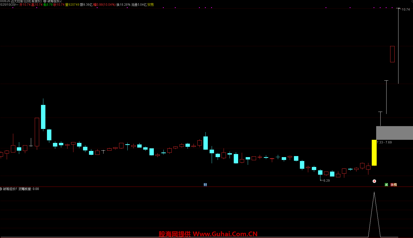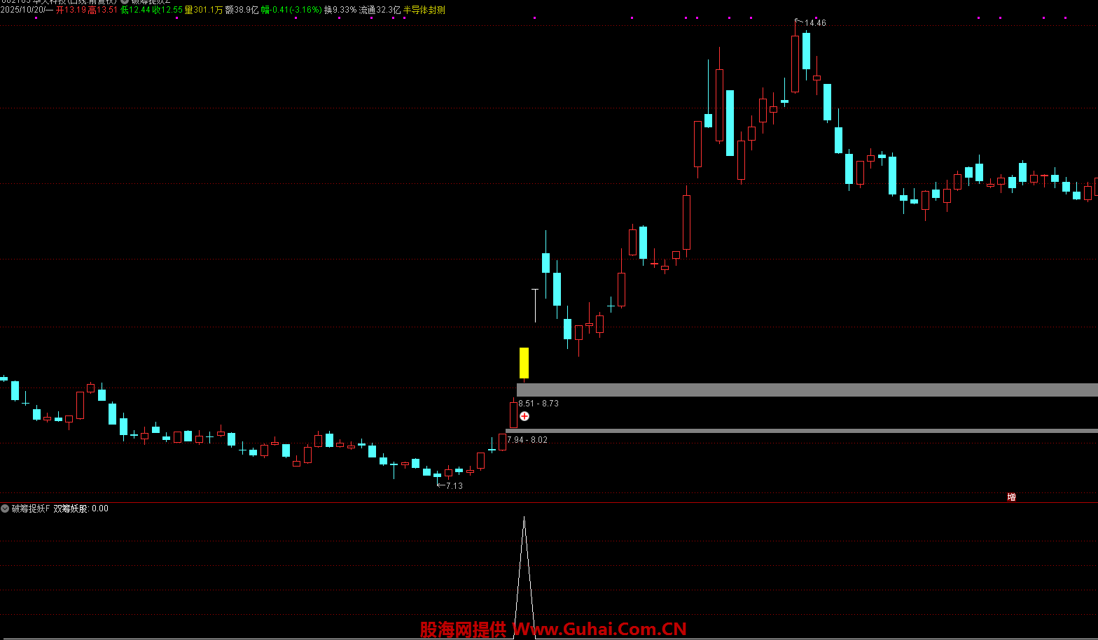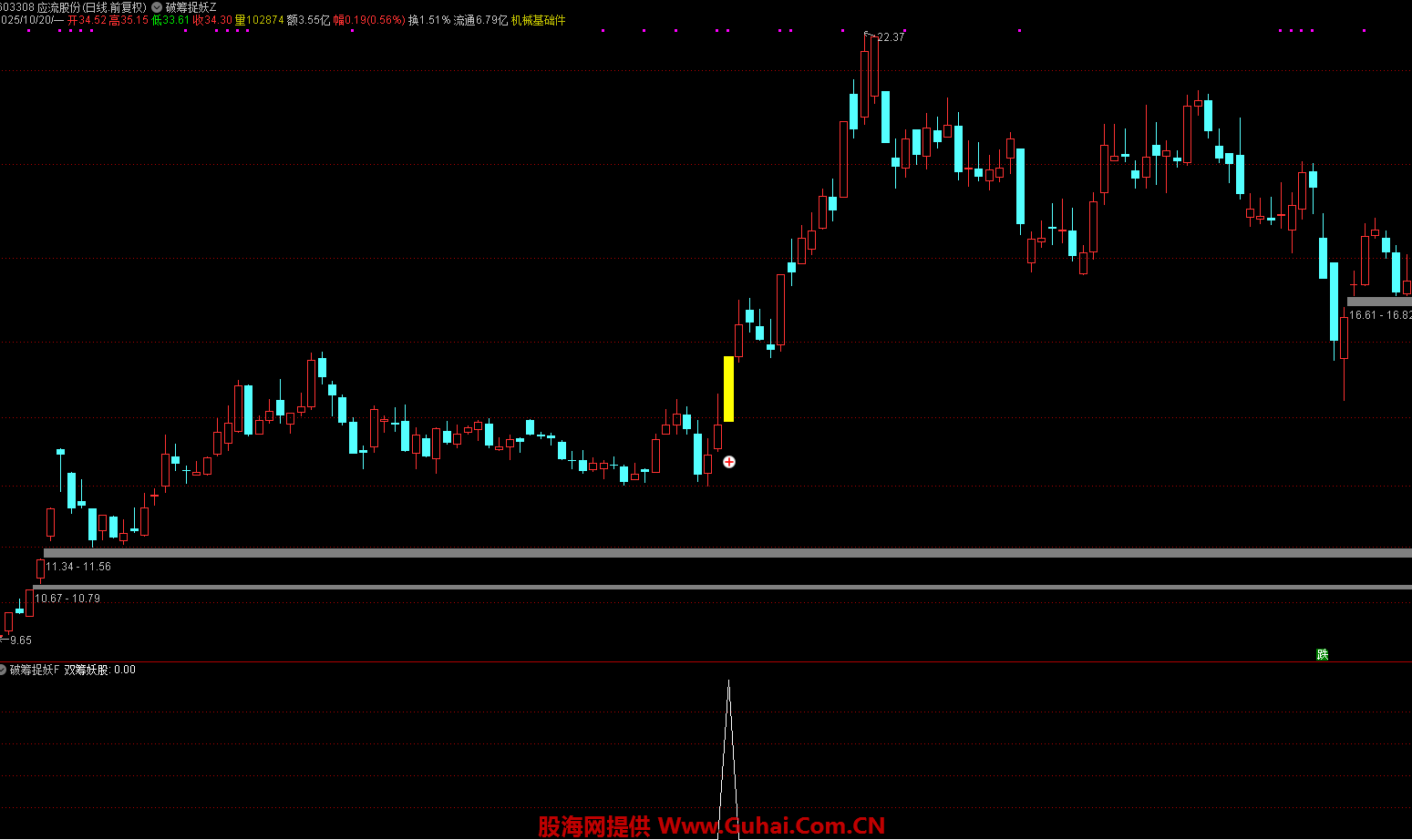 当指标出现"双筹妖股"图标及文字提示时,表明个股同时满足: