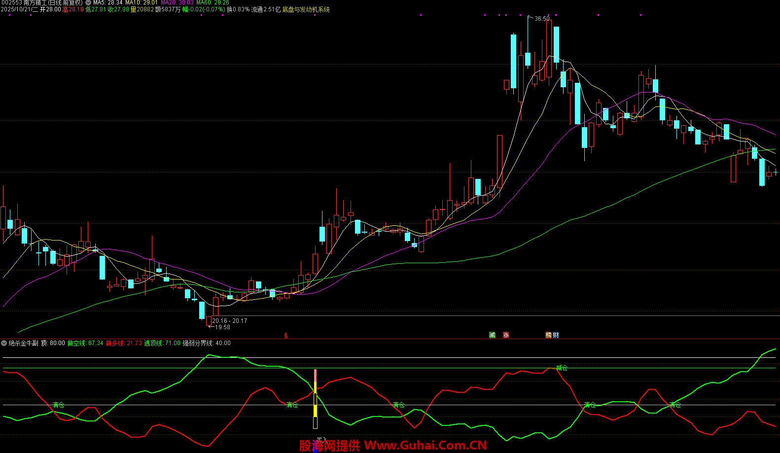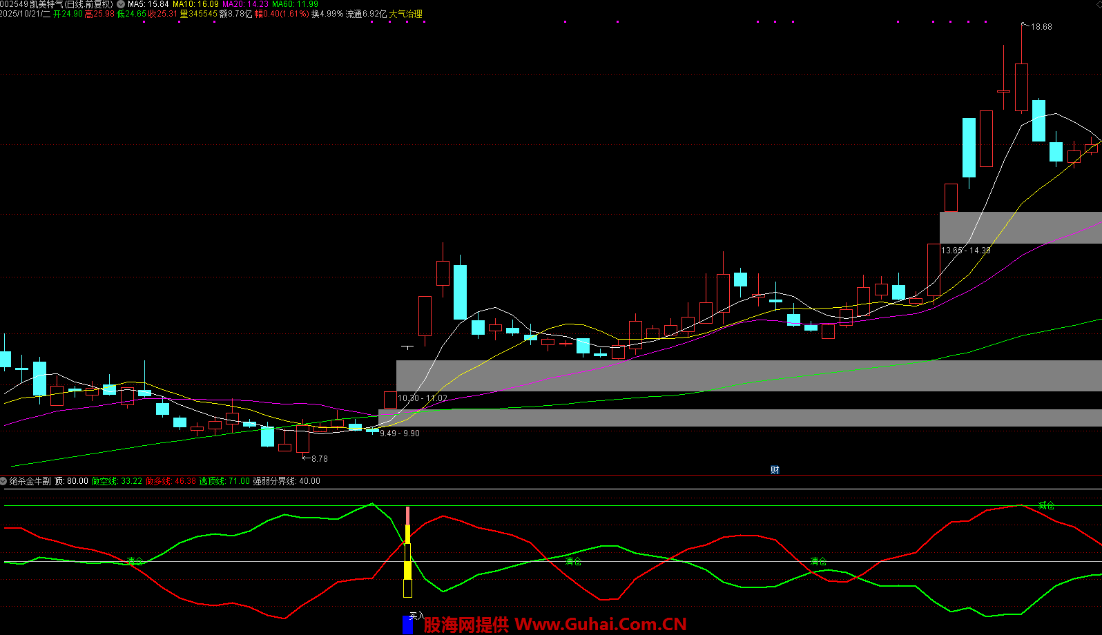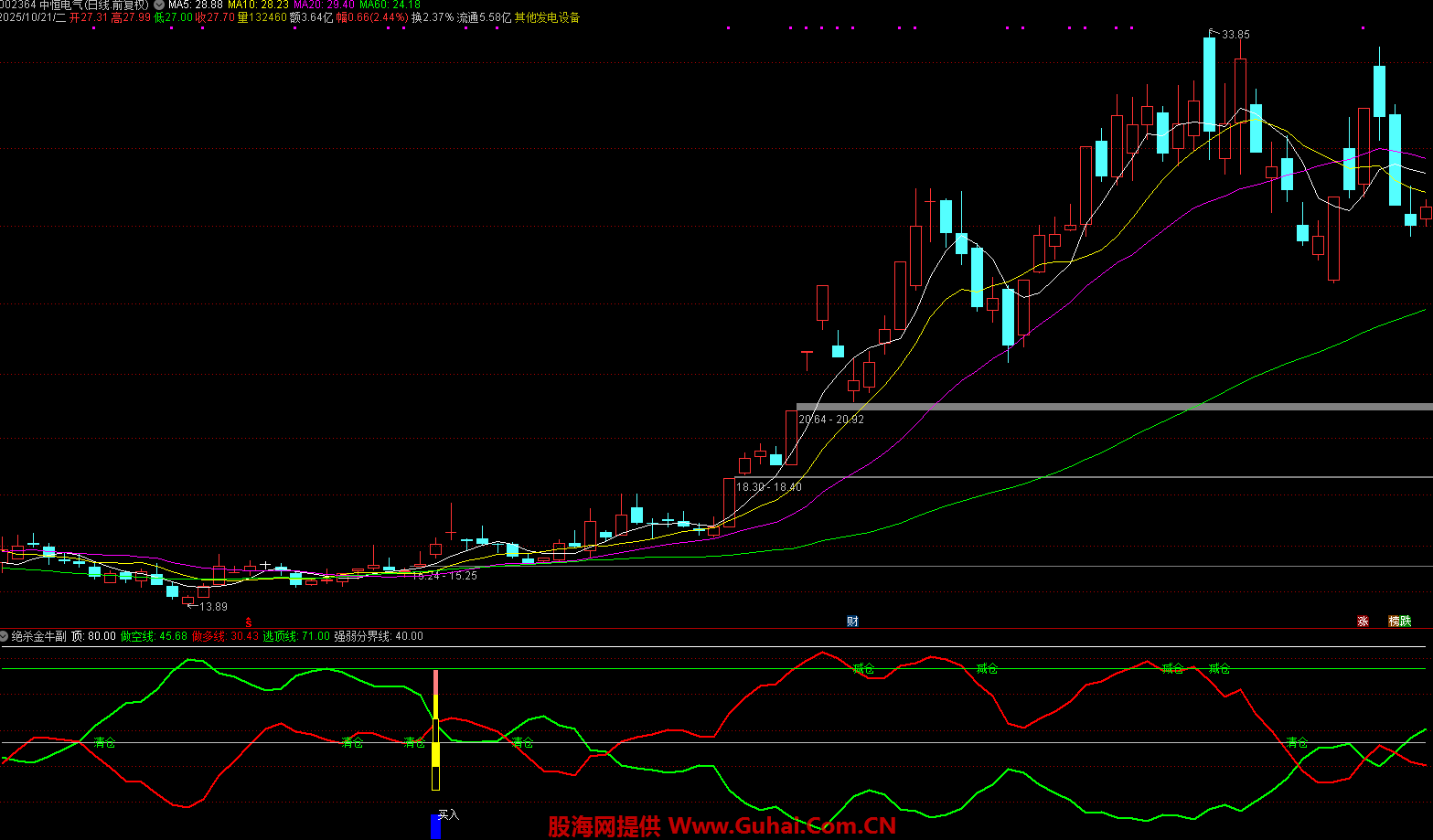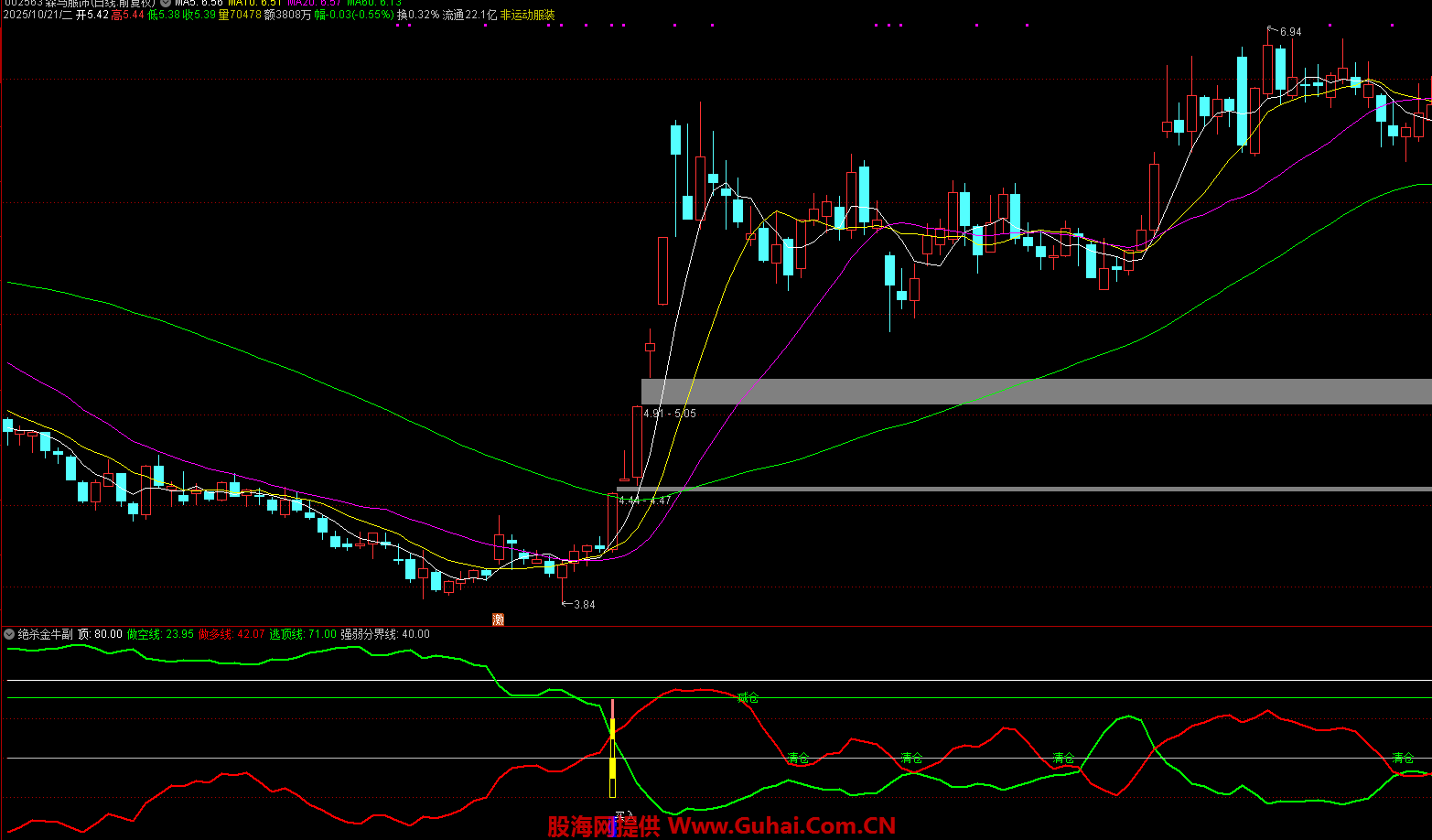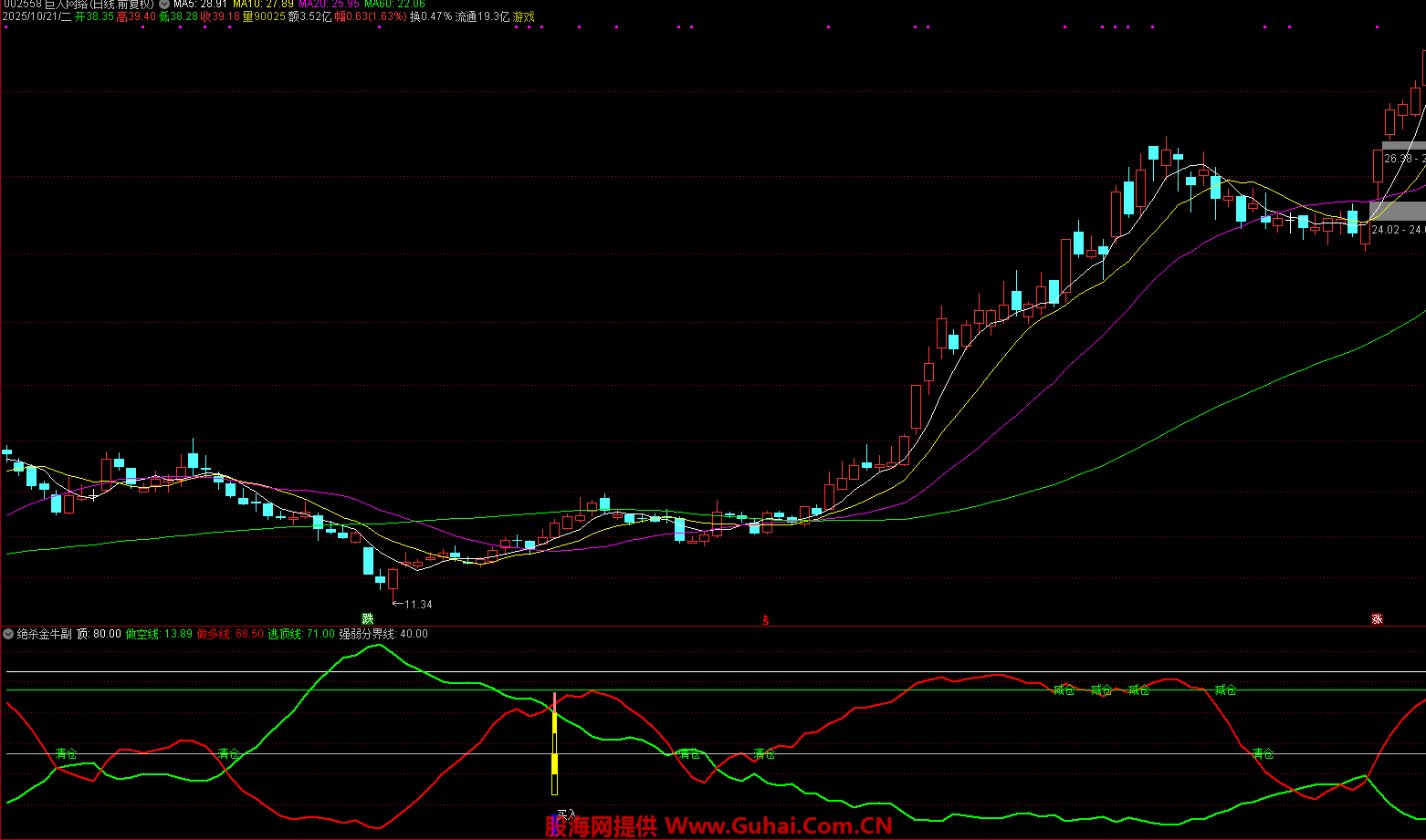 指标通过计算股价高低点位置判断趋势,做多线(红色)与做空线(绿色)交叉时发出信号,结合股价突破条件标记买入点,当股价触及逃顶线或强弱分界线时提示减仓/清仓。