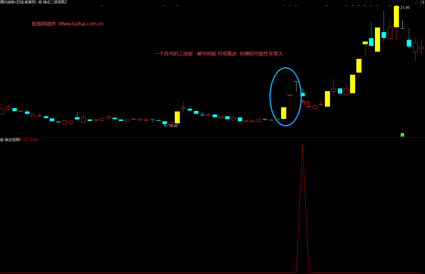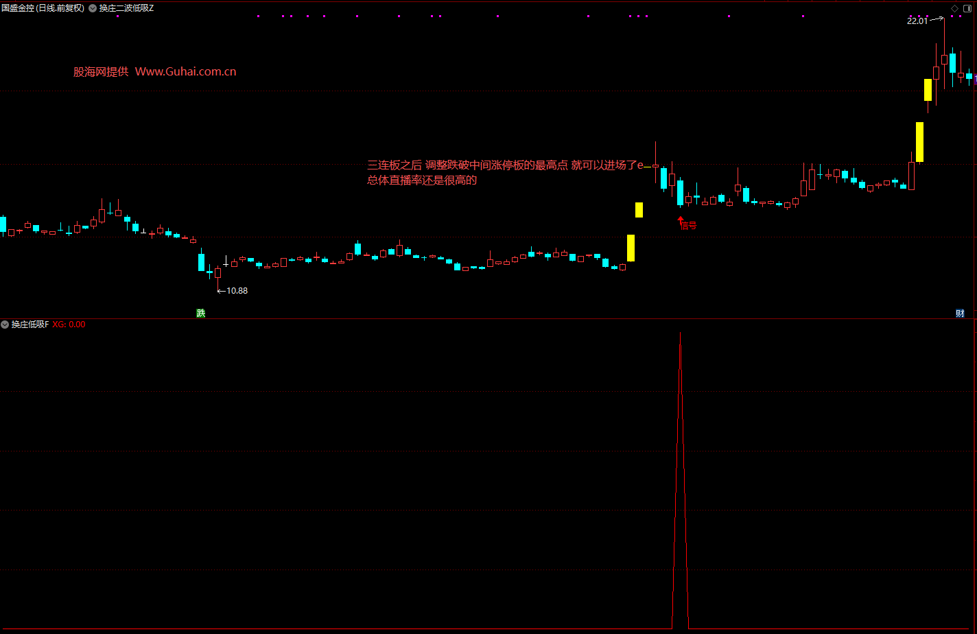 背后的逻辑实际上是主力之间的高低切换,或者是换庄,进场之后,支撑位就是前面三连板的中间那个涨停板的高点,这个是主力坚守的位置,破位说明主力做盘失败,我们也要离场;