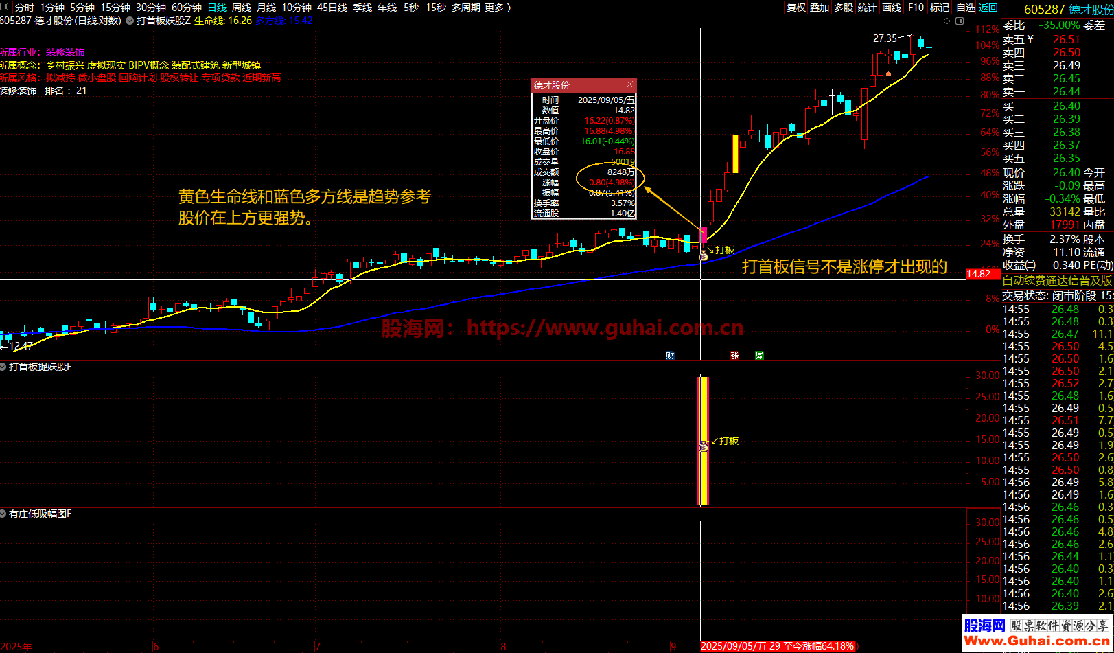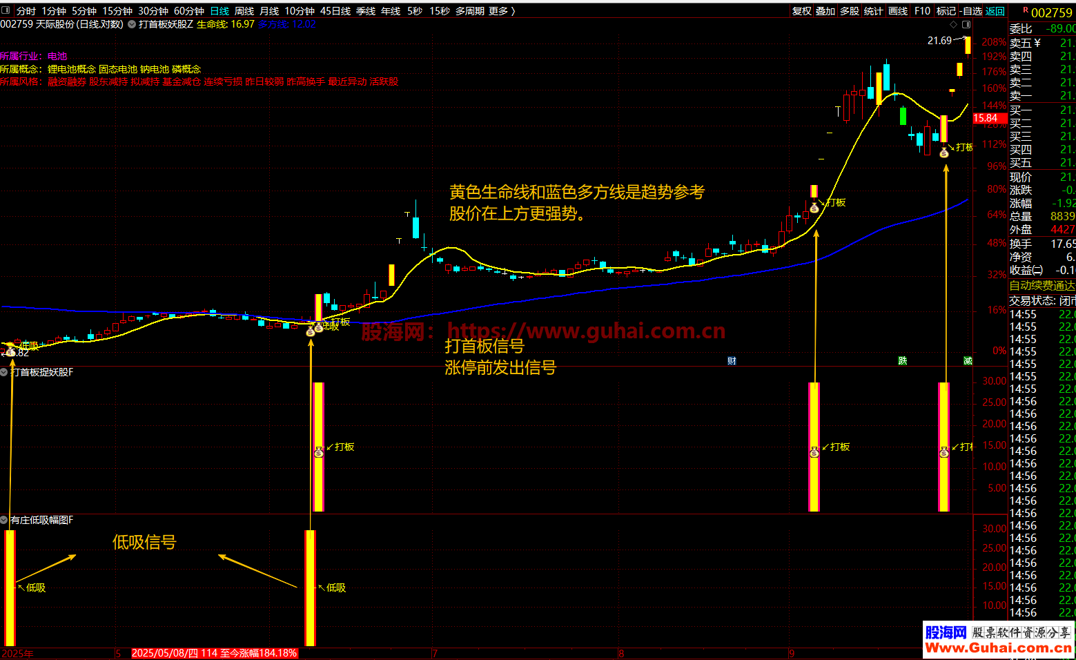 2、主图的黄色生命线和蓝色多方线是趋势参考,股价在上方更强势