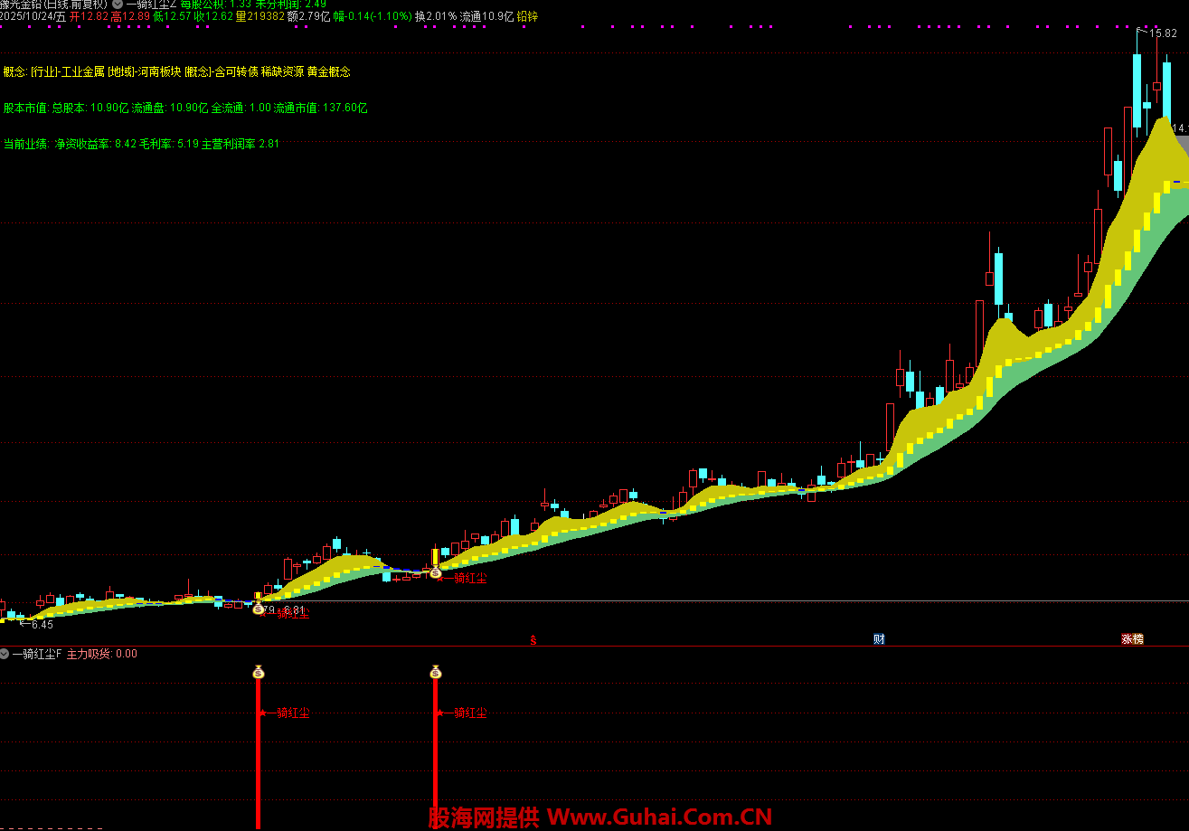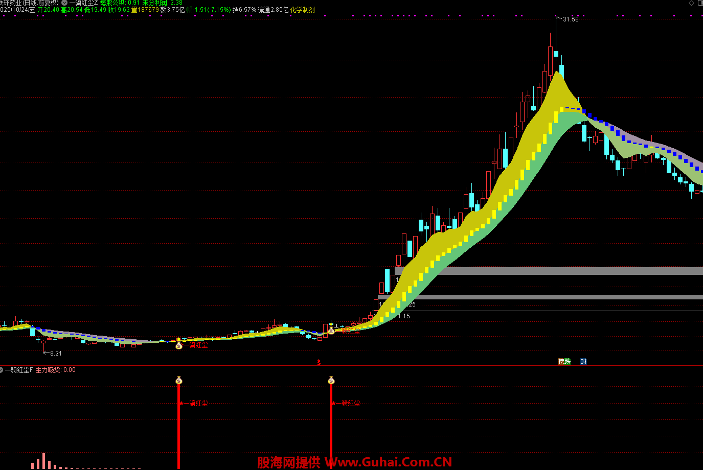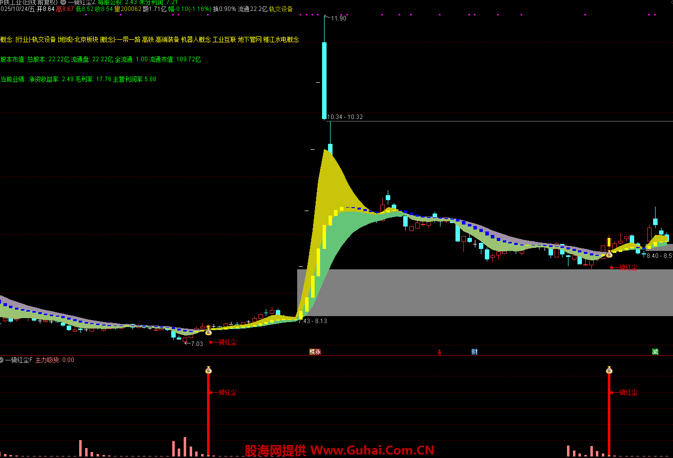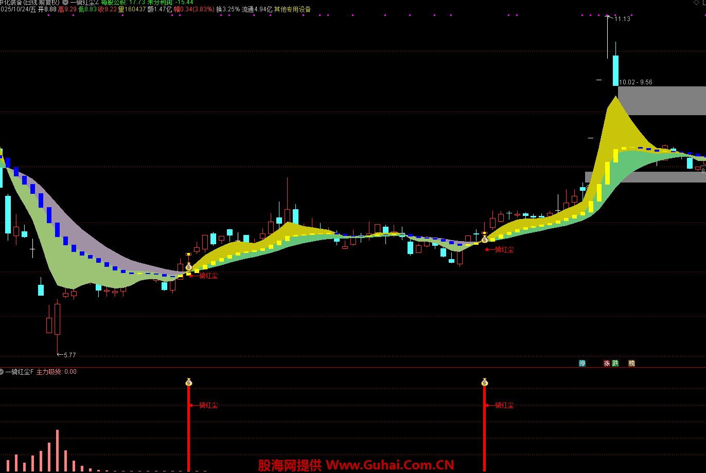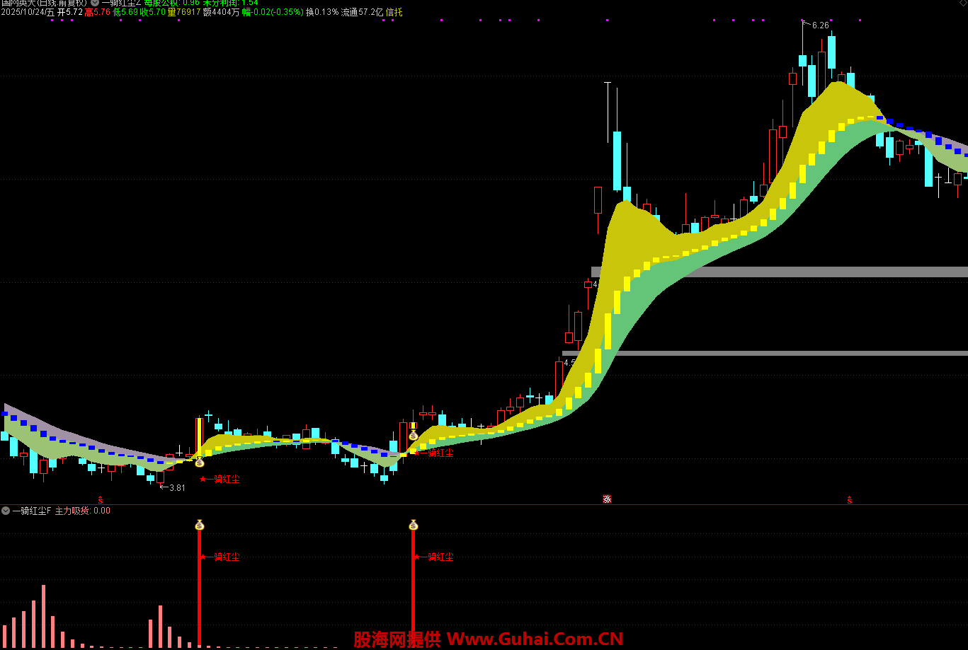 1 主图黄色柱提示向上趋势+副图提示有主力吸货,当有主力吸货后出现"一骑红尘"的信号,意味着即将起飞,可低吸介入。