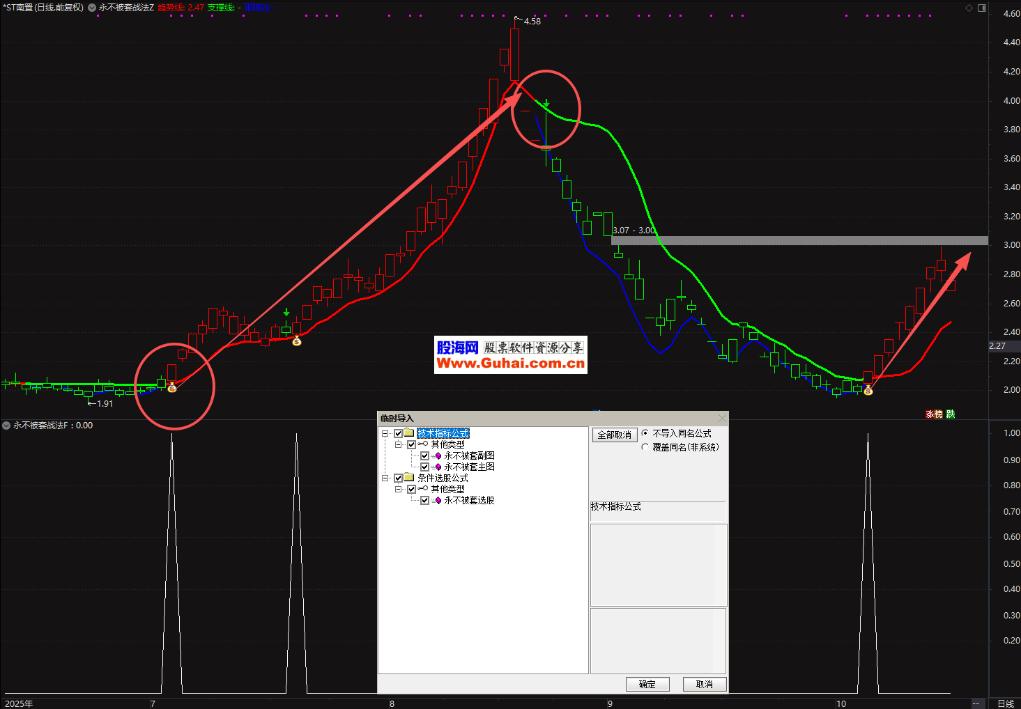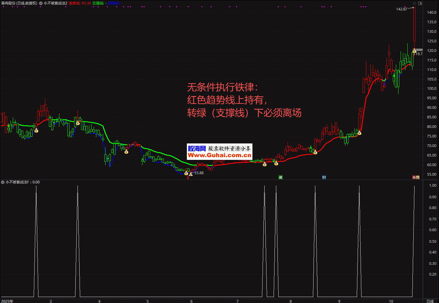 通达信永不被套战法指标无条件执行铁律:红色趋势线上持有,转绿(支撑线)下必须离场。一句话:红看涨,绿看跌