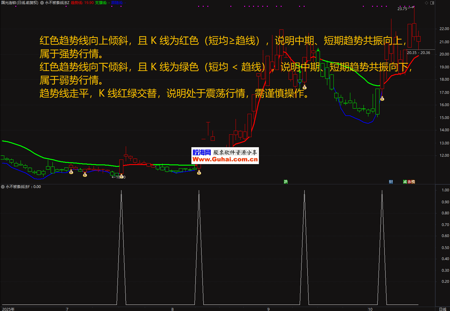 红色趋势线向上倾斜,且 K 线为红色(短均≥趋线),说明中期、短期趋势共振向上,属于强势行情。