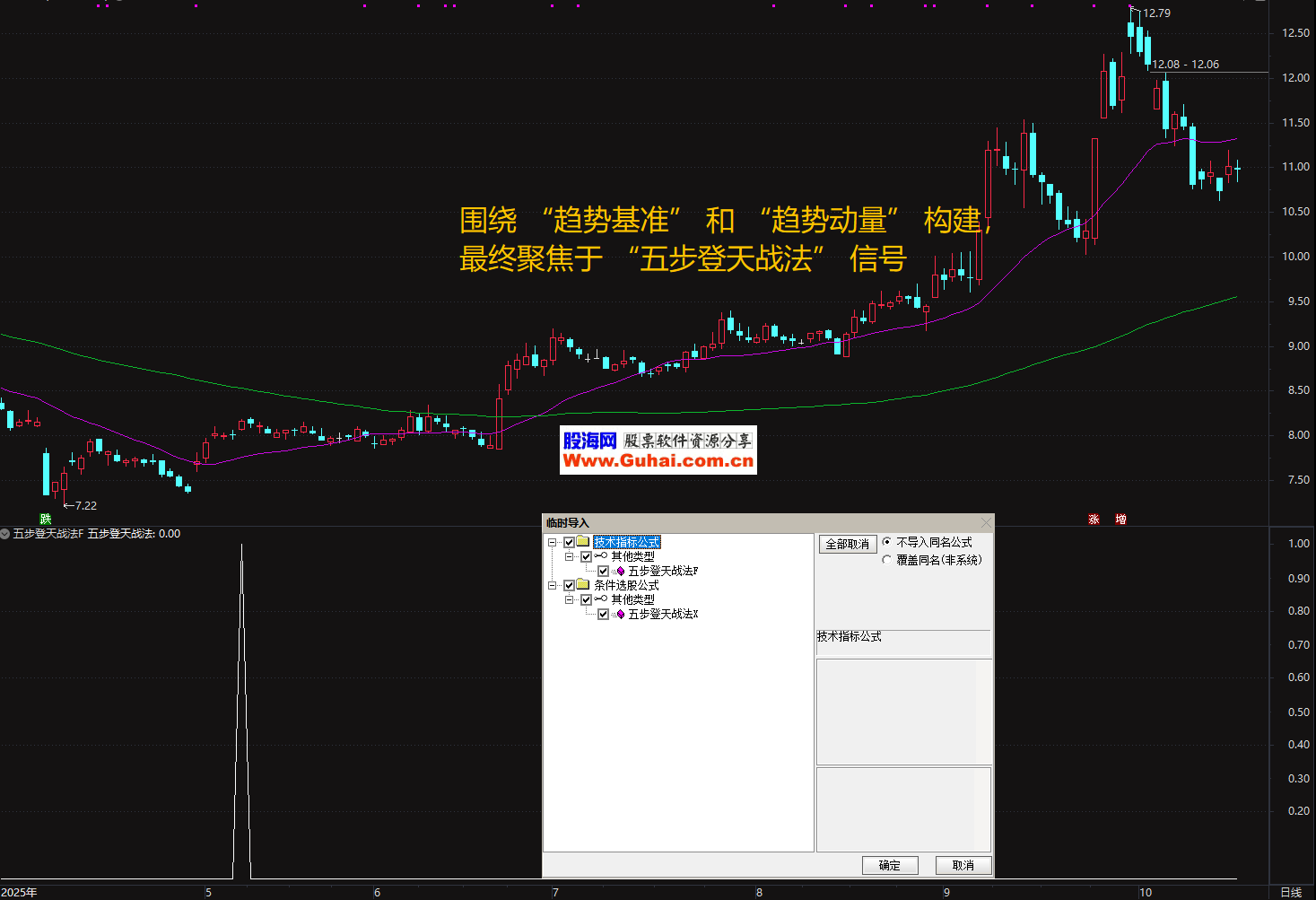 通达信五步登天战法指标公式围绕 “趋势基准” 和 “趋势动量” 构建,最终聚焦于 “五步登天战法” 信号