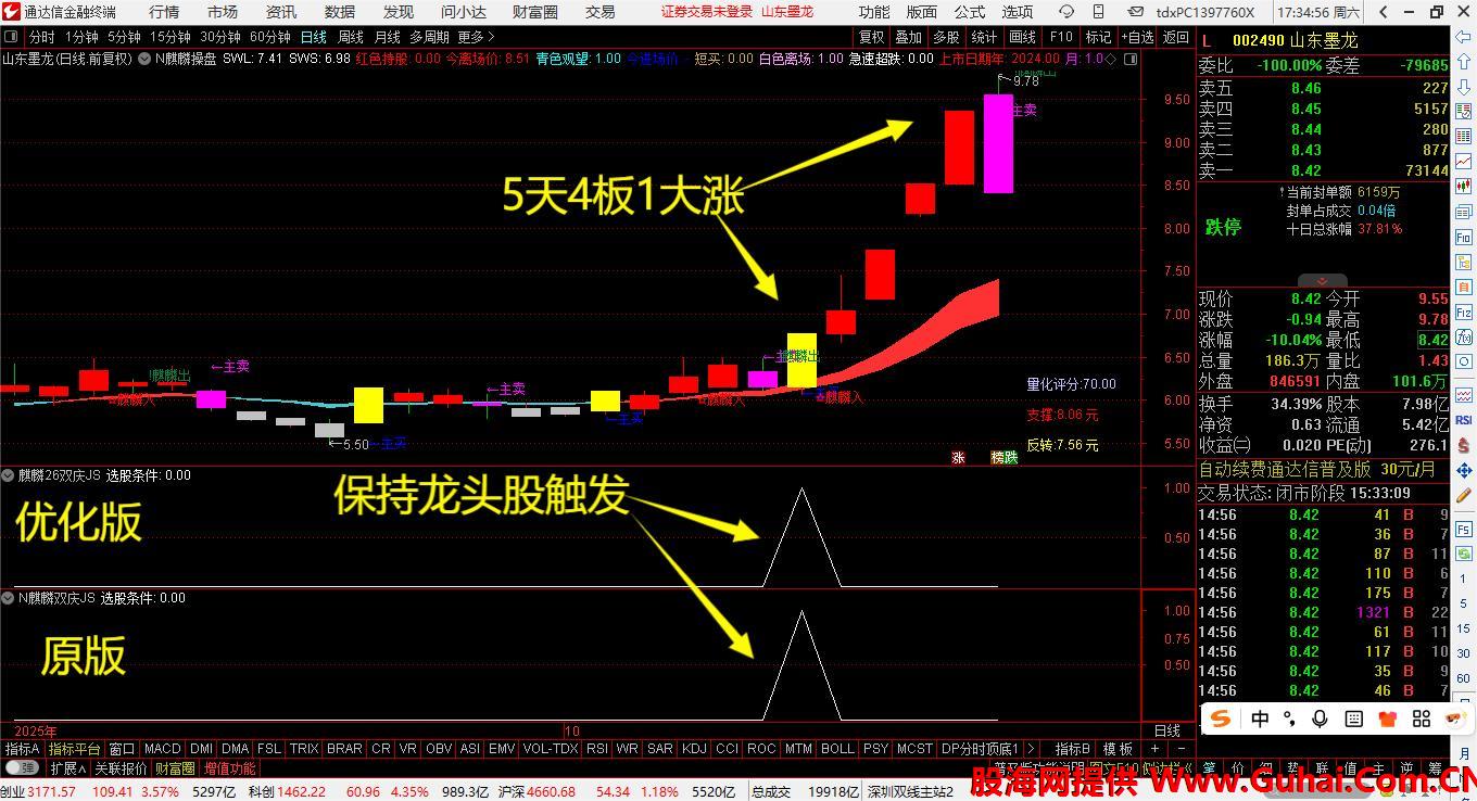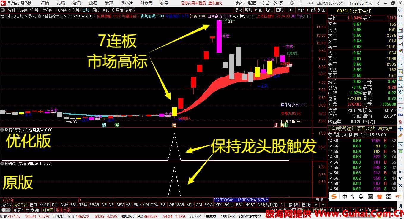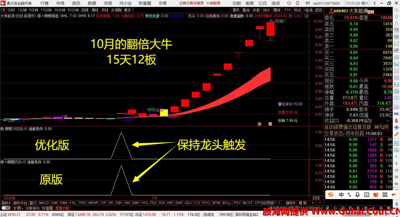 我们在9月28日发布免费的“N麒麟10月双庆”策略选股器,经过市场检验得到众多股友好评:触发了大有能源、山东墨龙、蓝丰生物、菲林格尔等一众市场大牛股,利润丰厚;但是该版本同样有较多的“假突破”信号,不够聚焦,股友们提出优化诉求。经专研优化版本出炉;改善效果:保持原有逻辑,三日胜利率比原版本提升20%+,过滤掉原版本“假突破”信号的70%+,龙头捕捉率提升50%+;精髓在于:不在普通机会上浪费时间,只在“技术面+资金面+稀缺性+动量面”四重共振的黄金节点重拳出击,用极高的筛选标准换取极高的胜率回报,只做确定性最高的龙头起爆点,自适应龙头模式目标是适应到2026年选股需求。